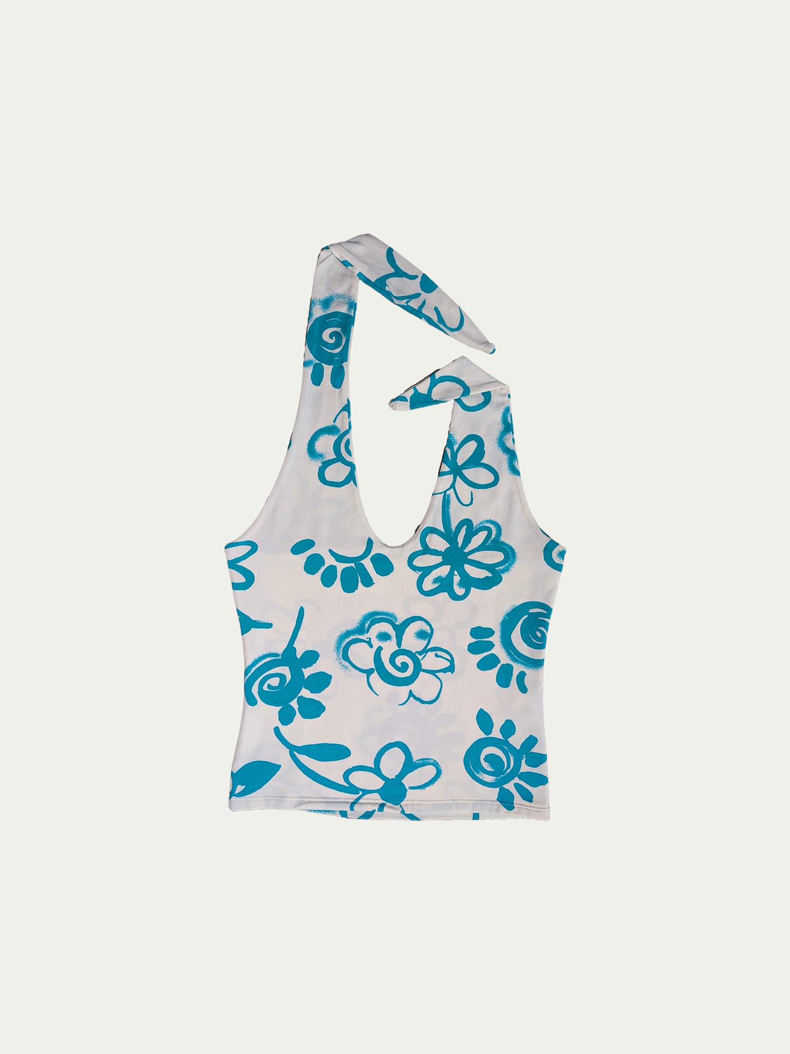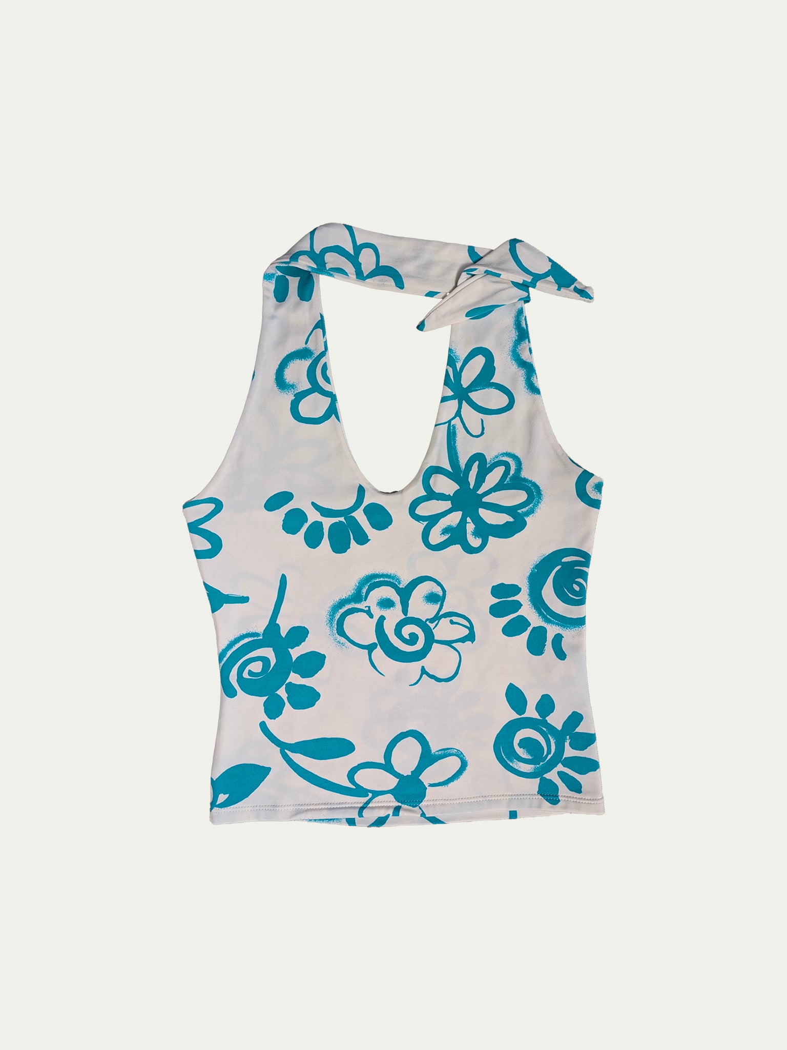 Y2K white halter tie-top with a turquoise print and asymmetrical tie straps, made of high-quality double-layered stretch fabric.