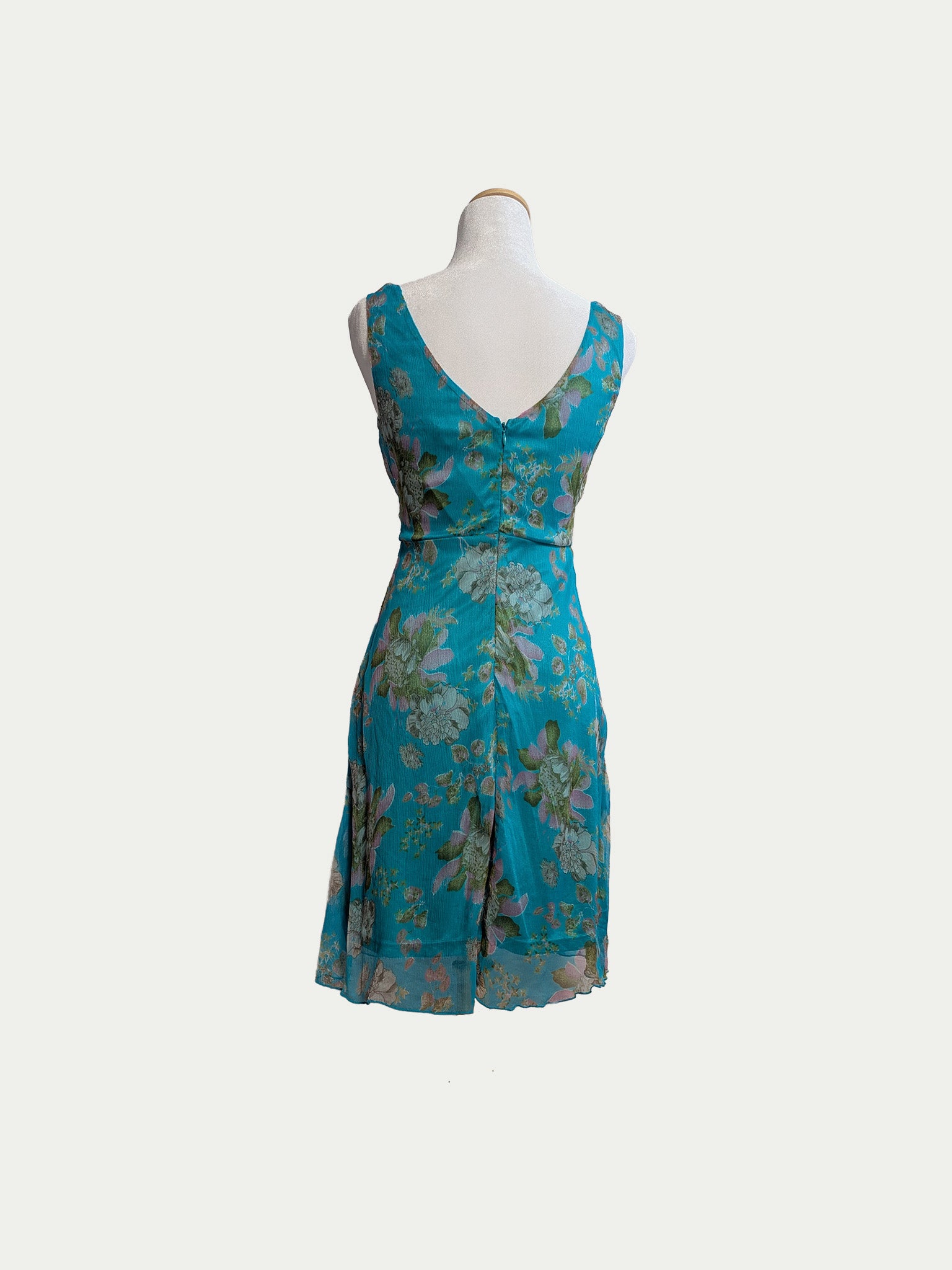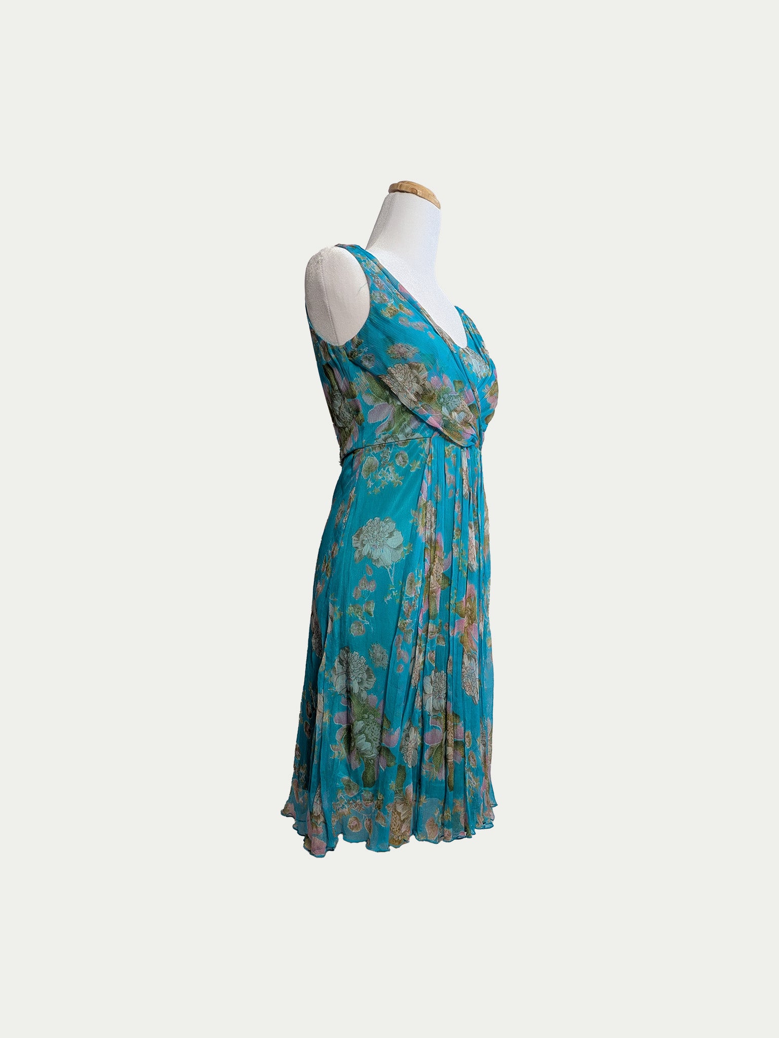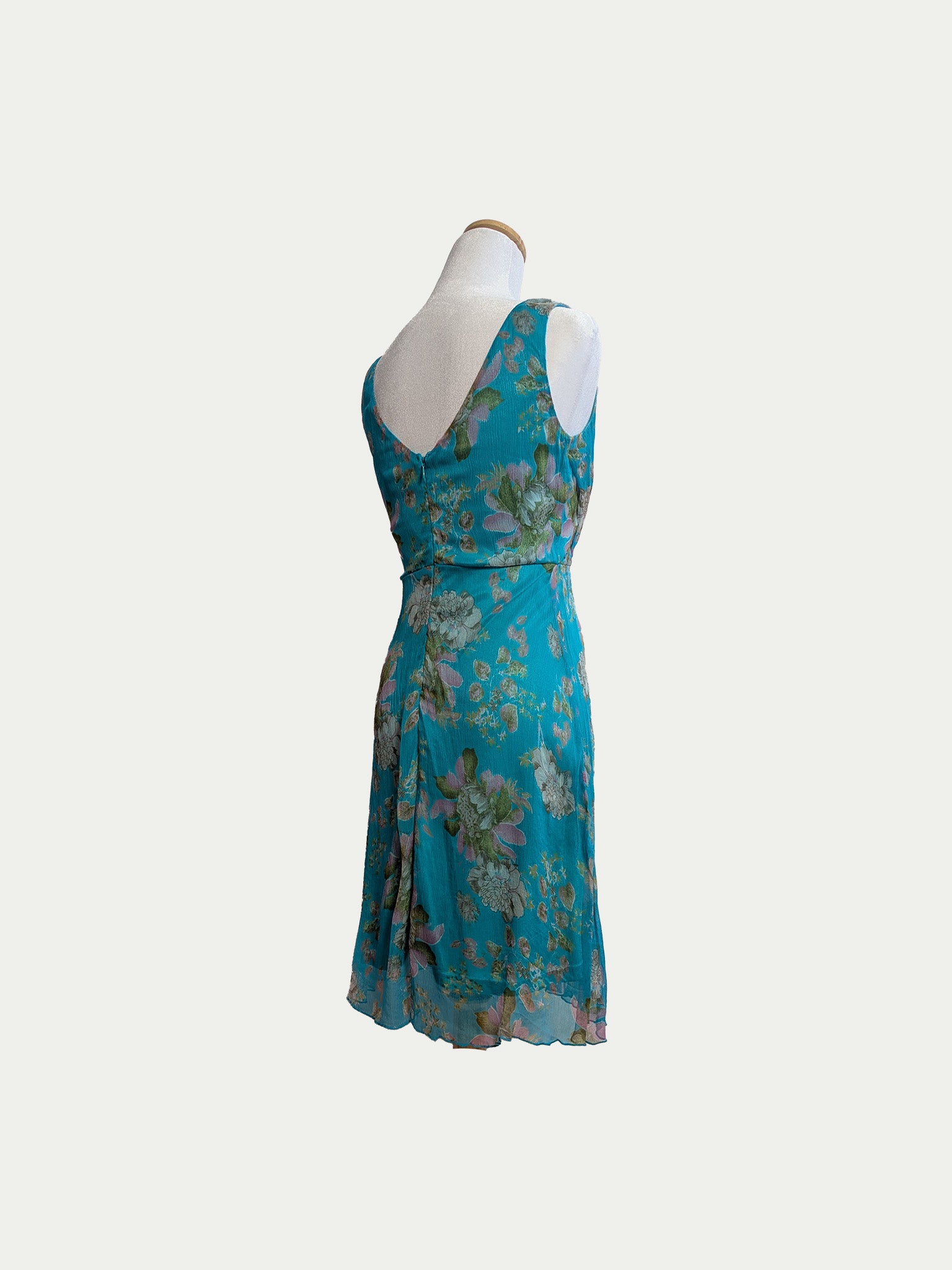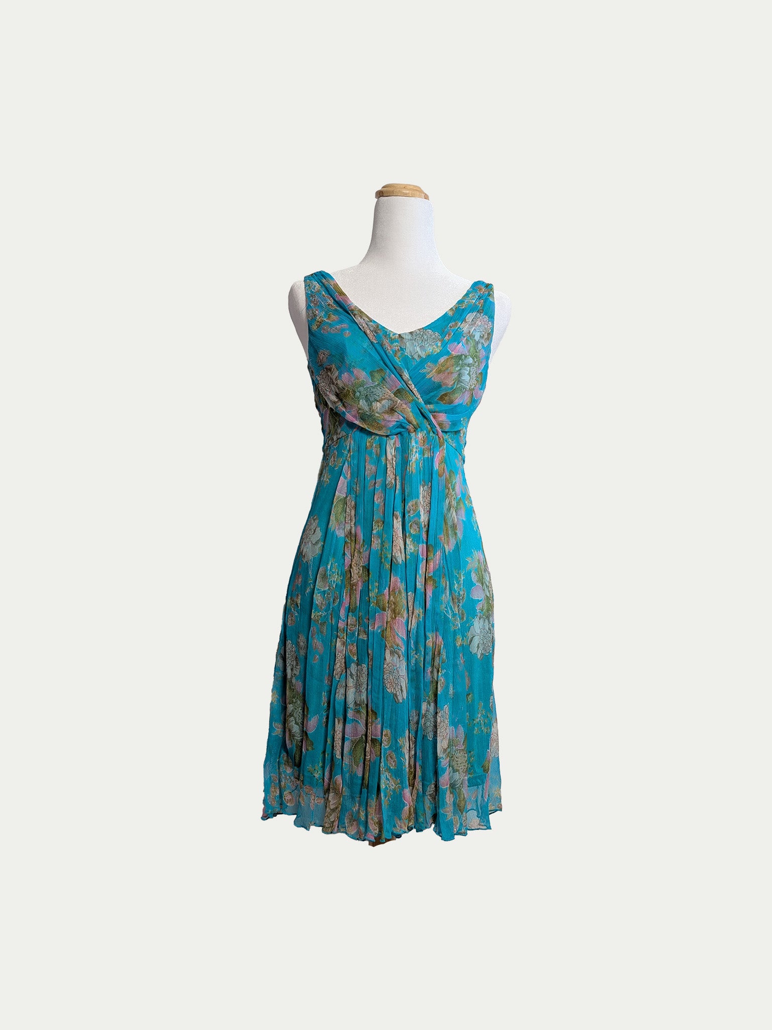 Silk turquoise midi dress featuring a wrap-style chest, multiple pleats at the waist, and a beautiful drape. Elegant and fluid, perfect for both evening and daytime events.