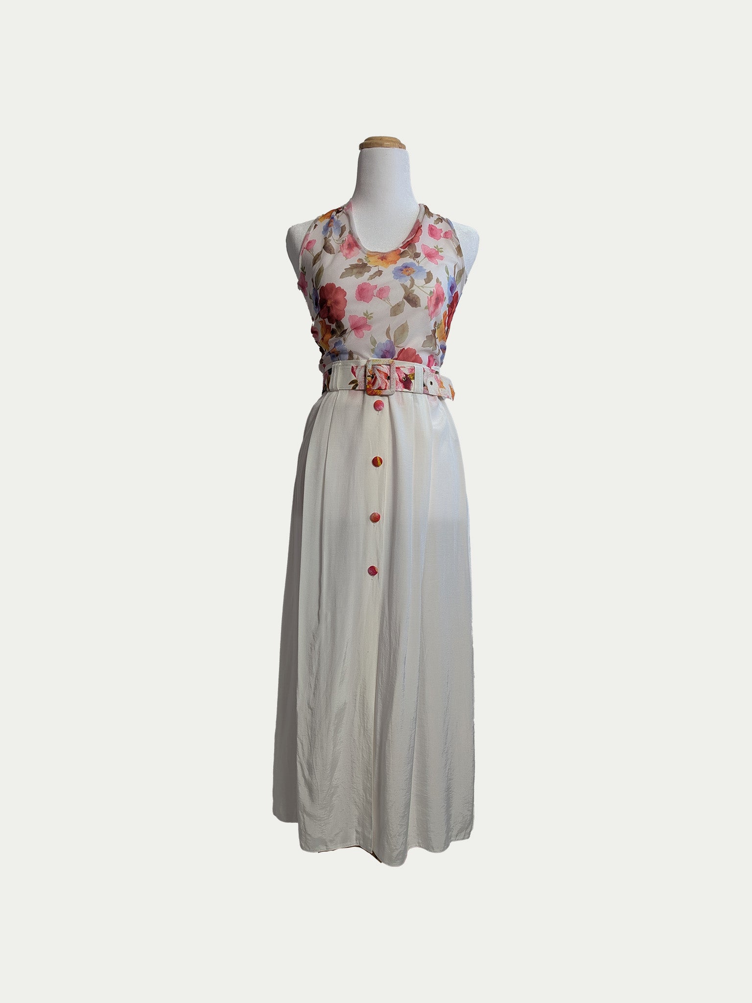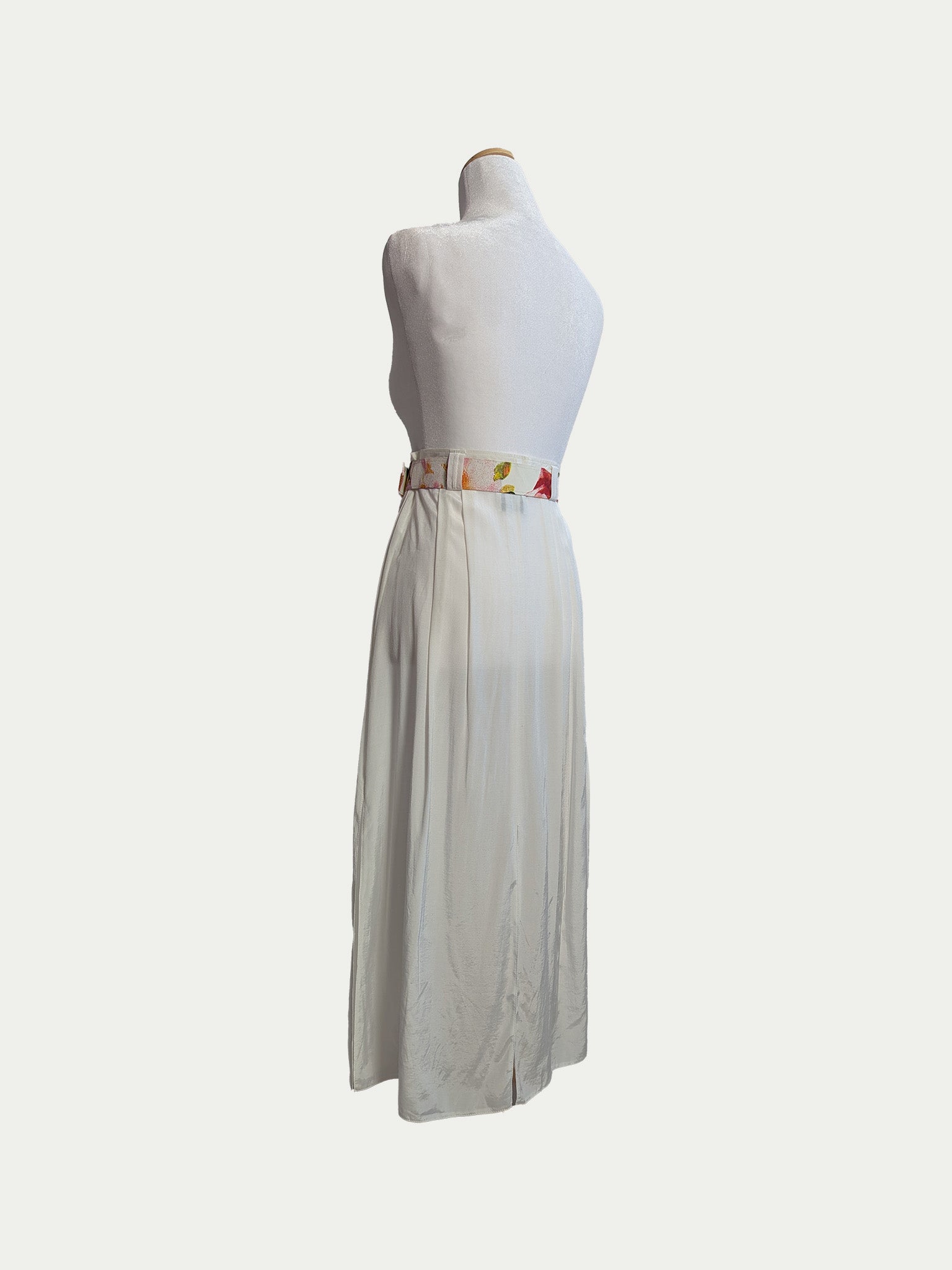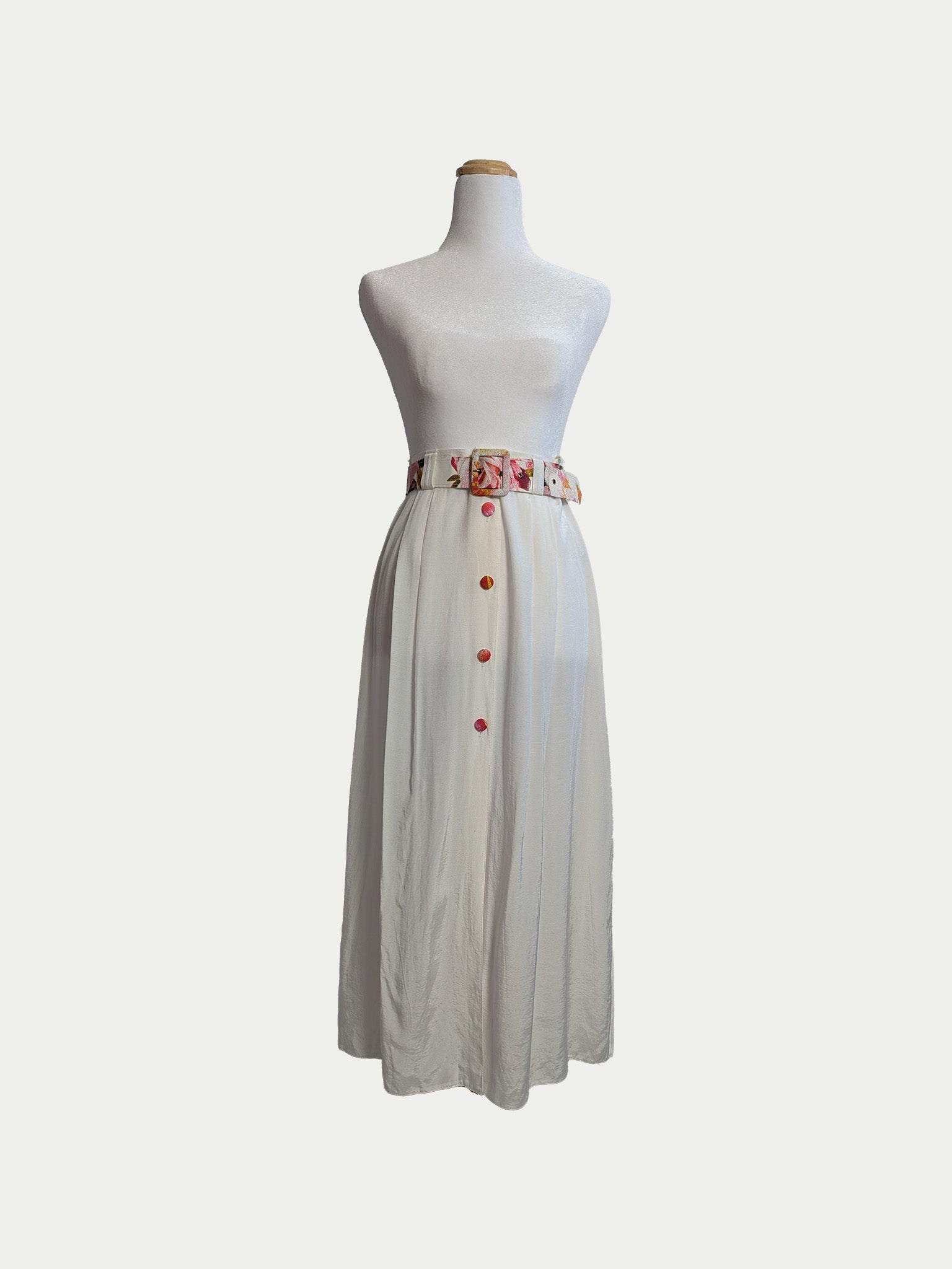 Early 90s maxi skirt made of high-quality, slightly shimmering viscose. Features a multicolored belt and matching buttons running along the full front closure. Designed with four deep slits at the front, back, and sides for striking movement.