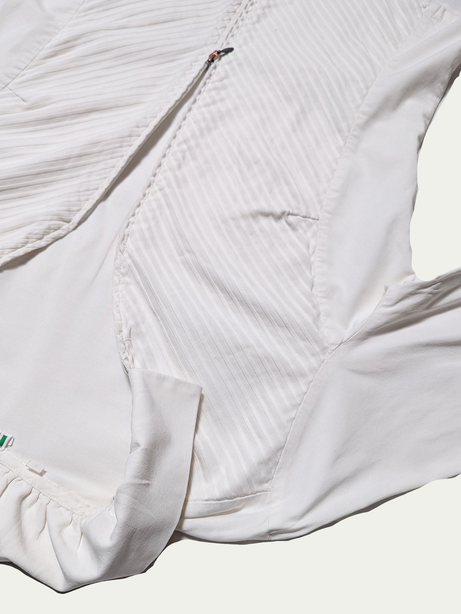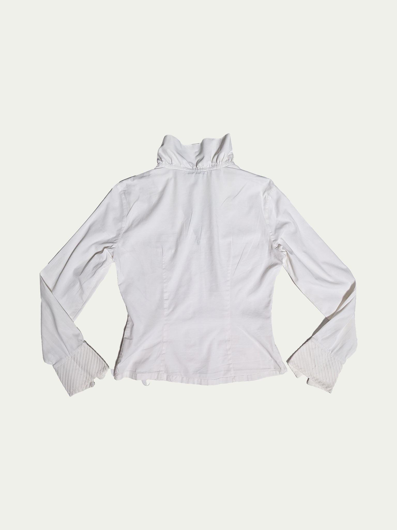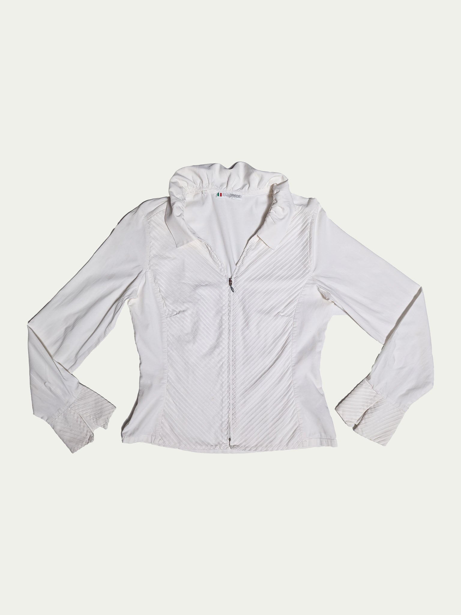 Features a royal collar, slitted cuffs, and a zipper closure.