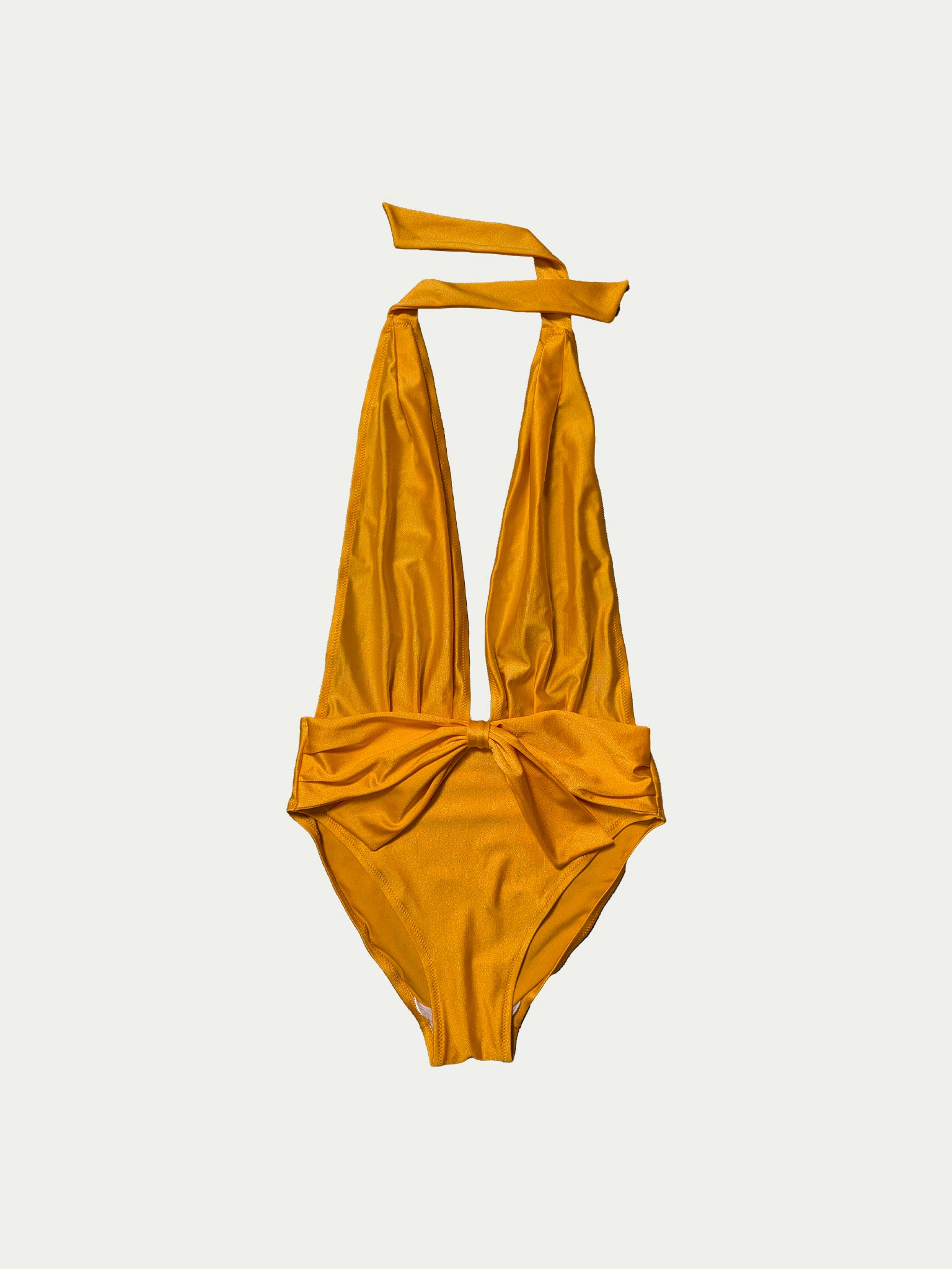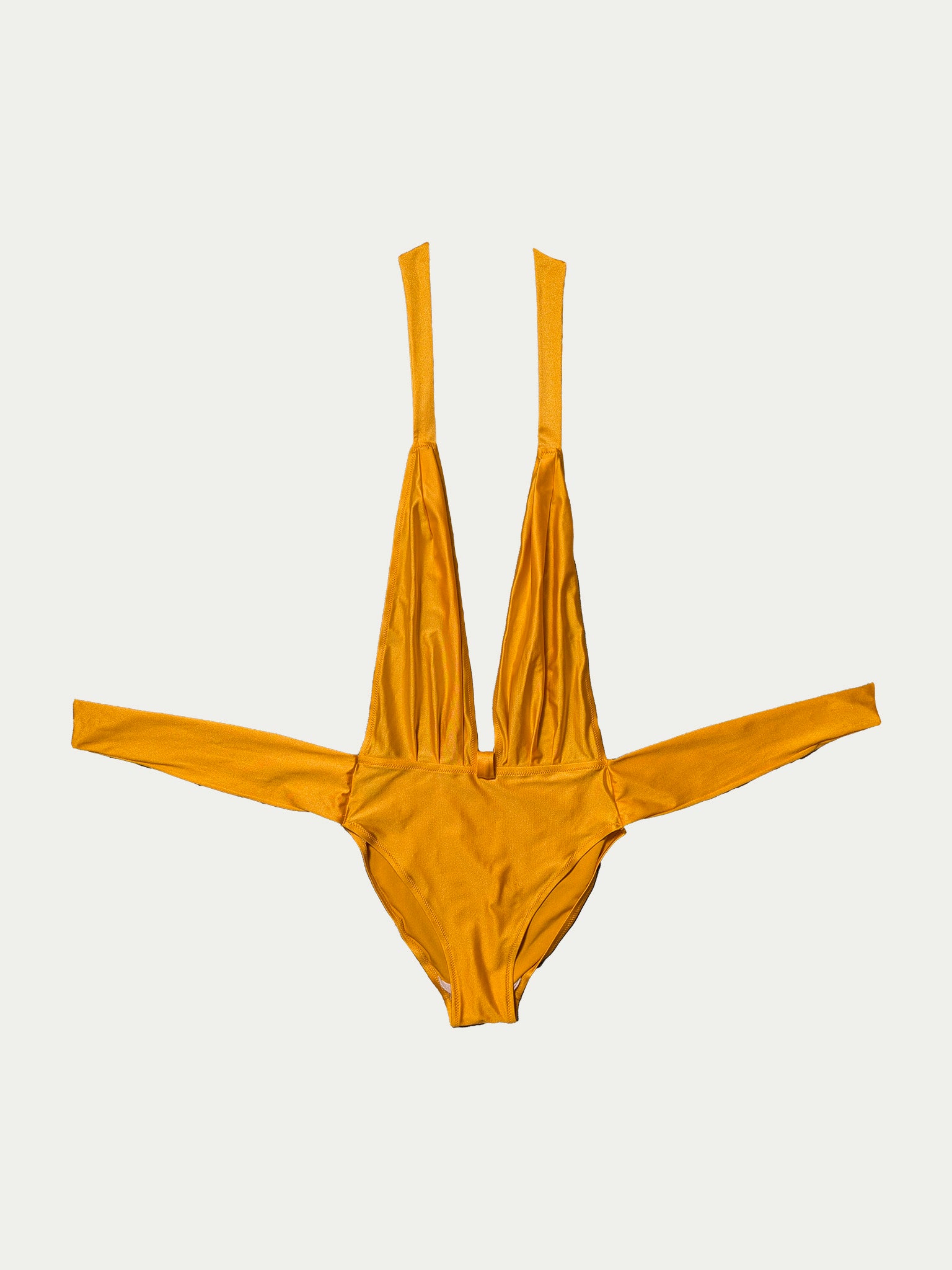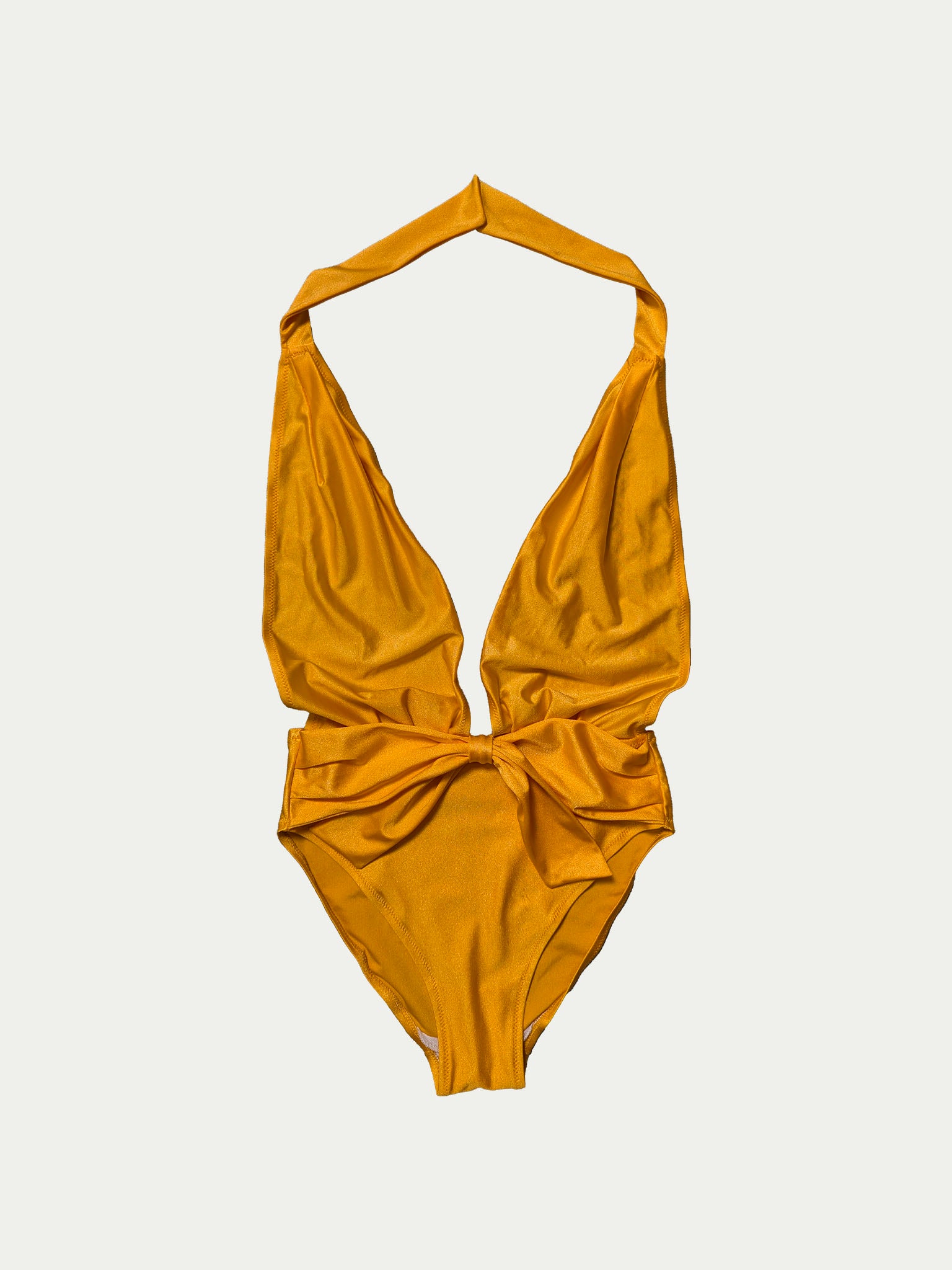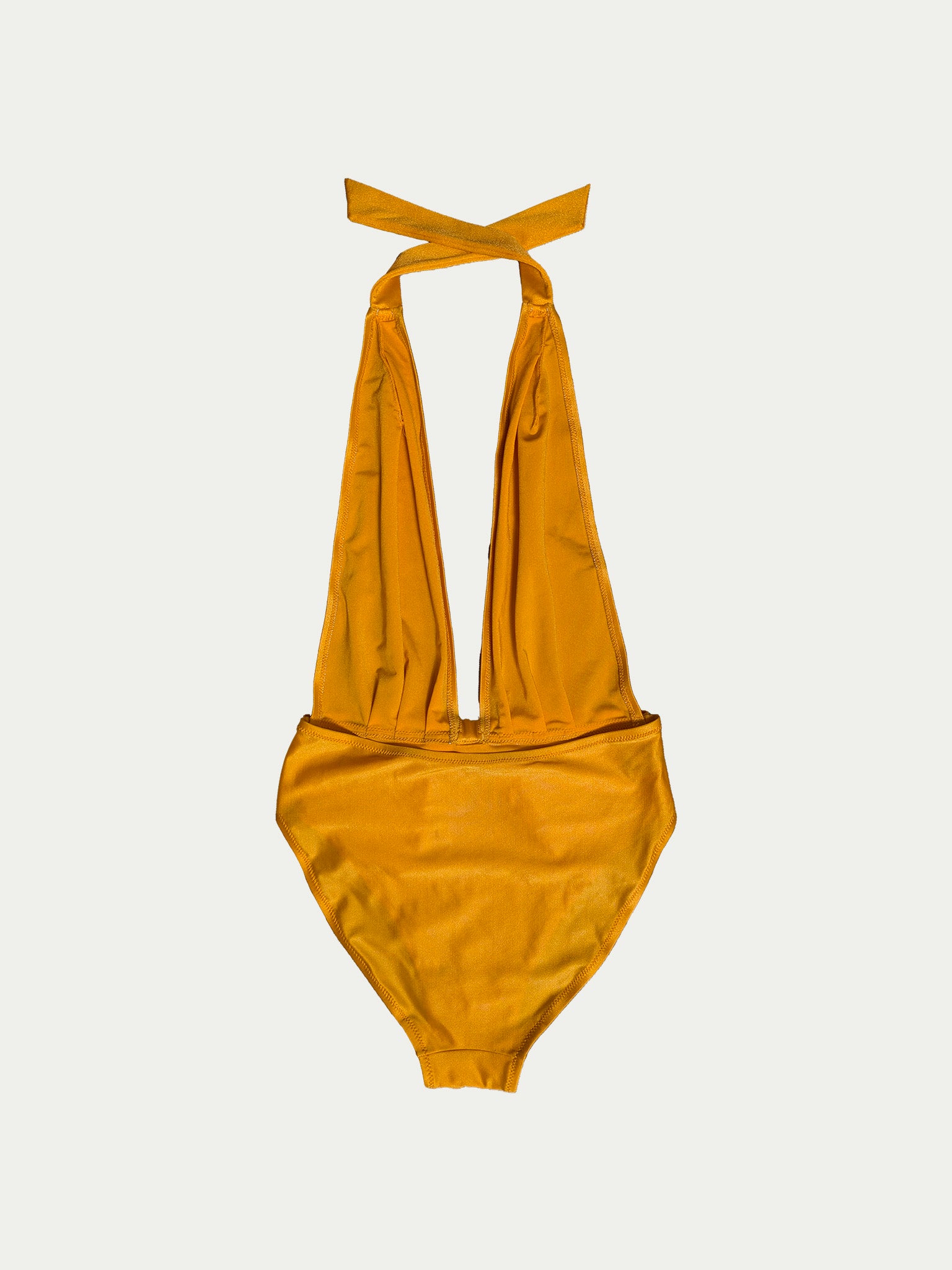 One-piece swimsuit in a yolk-yellow shade, featuring a high-waisted bottom, fully open back, and an extra-deep neckline formed by two pleated chest tie straps.