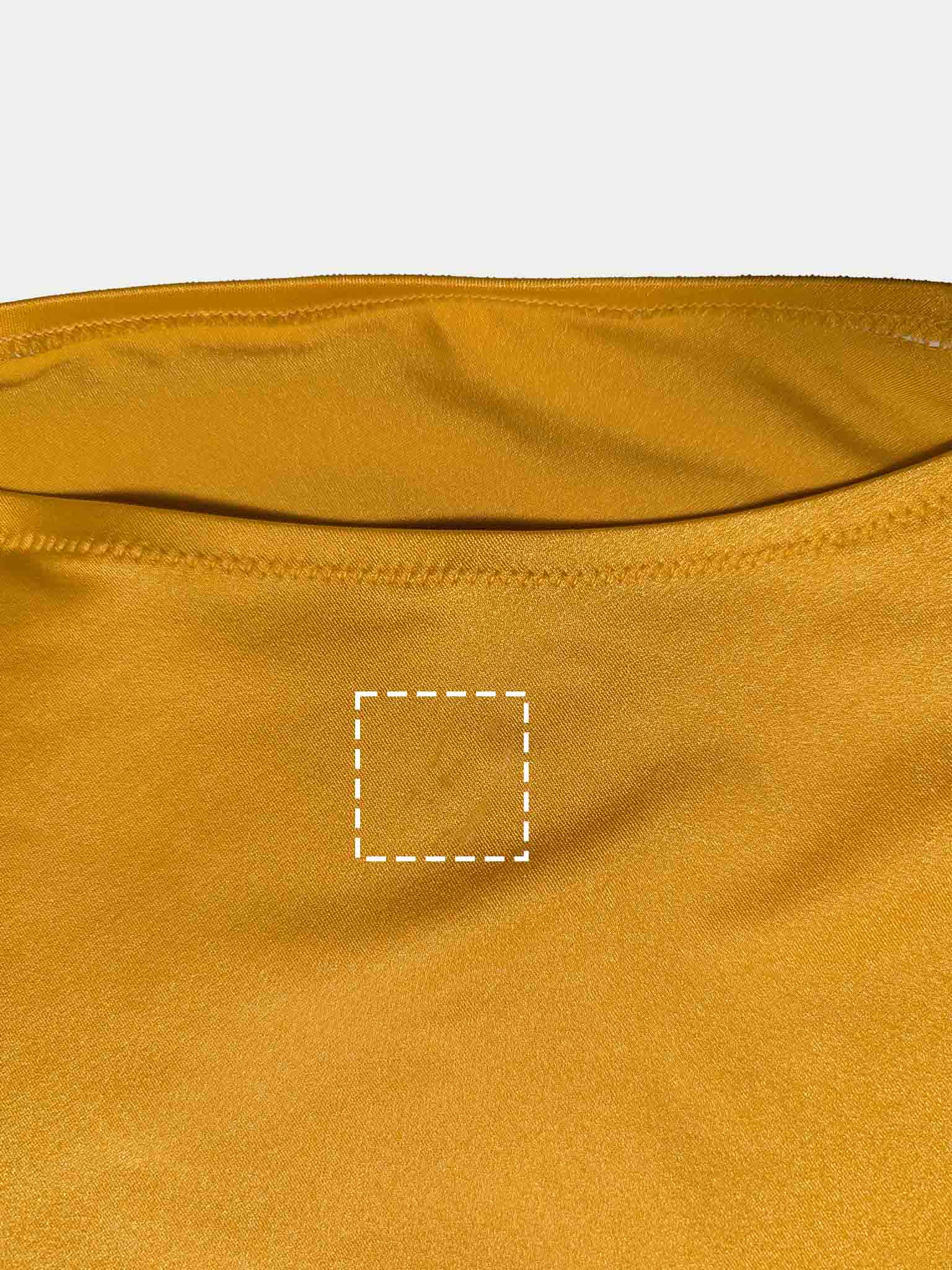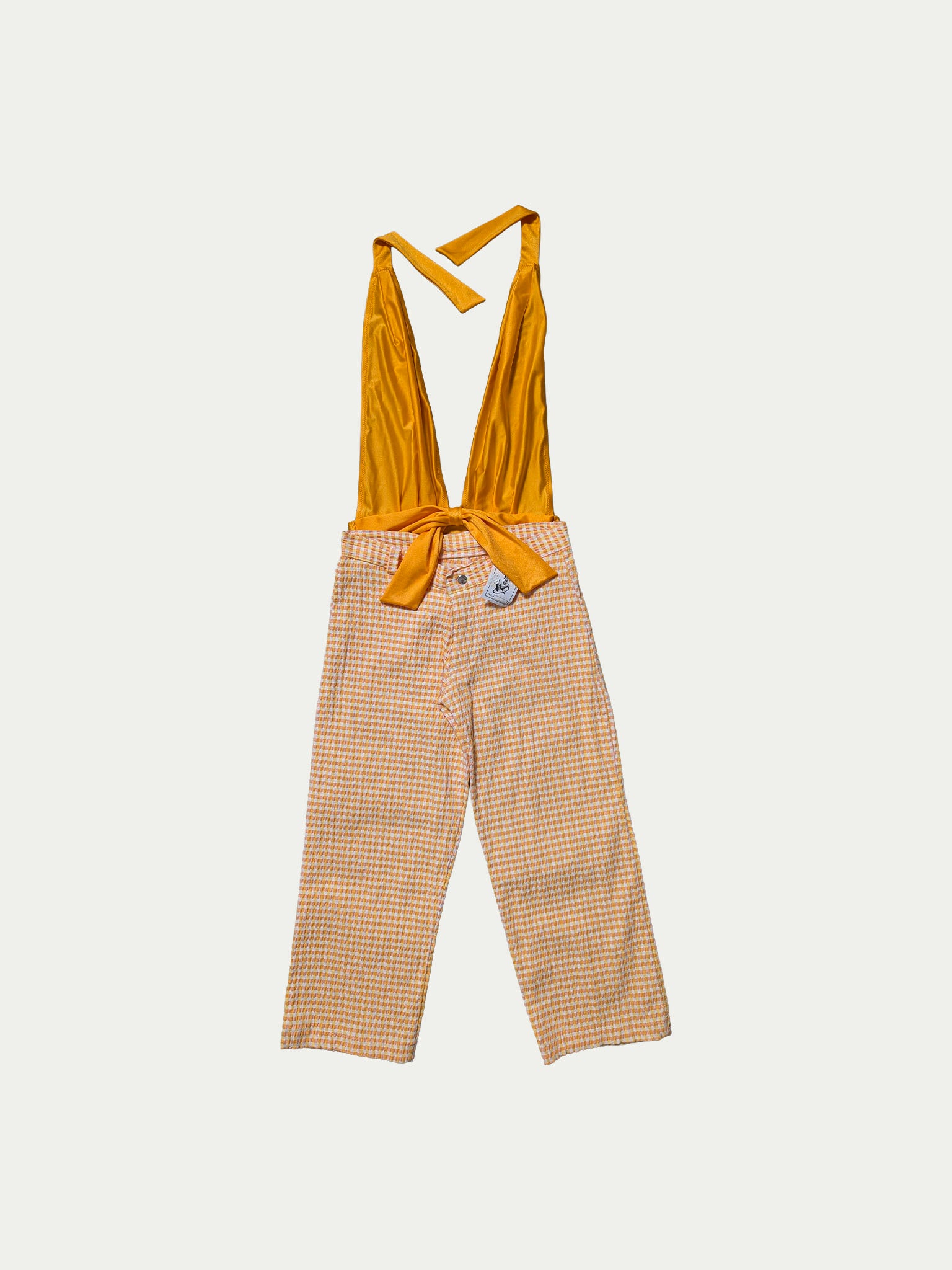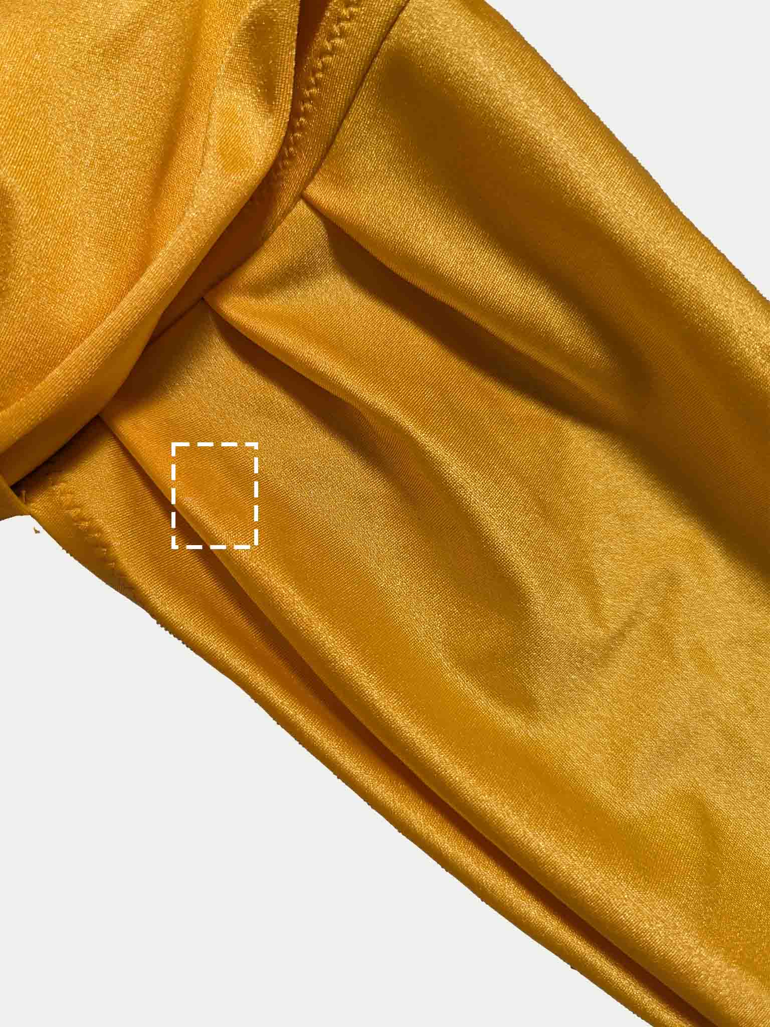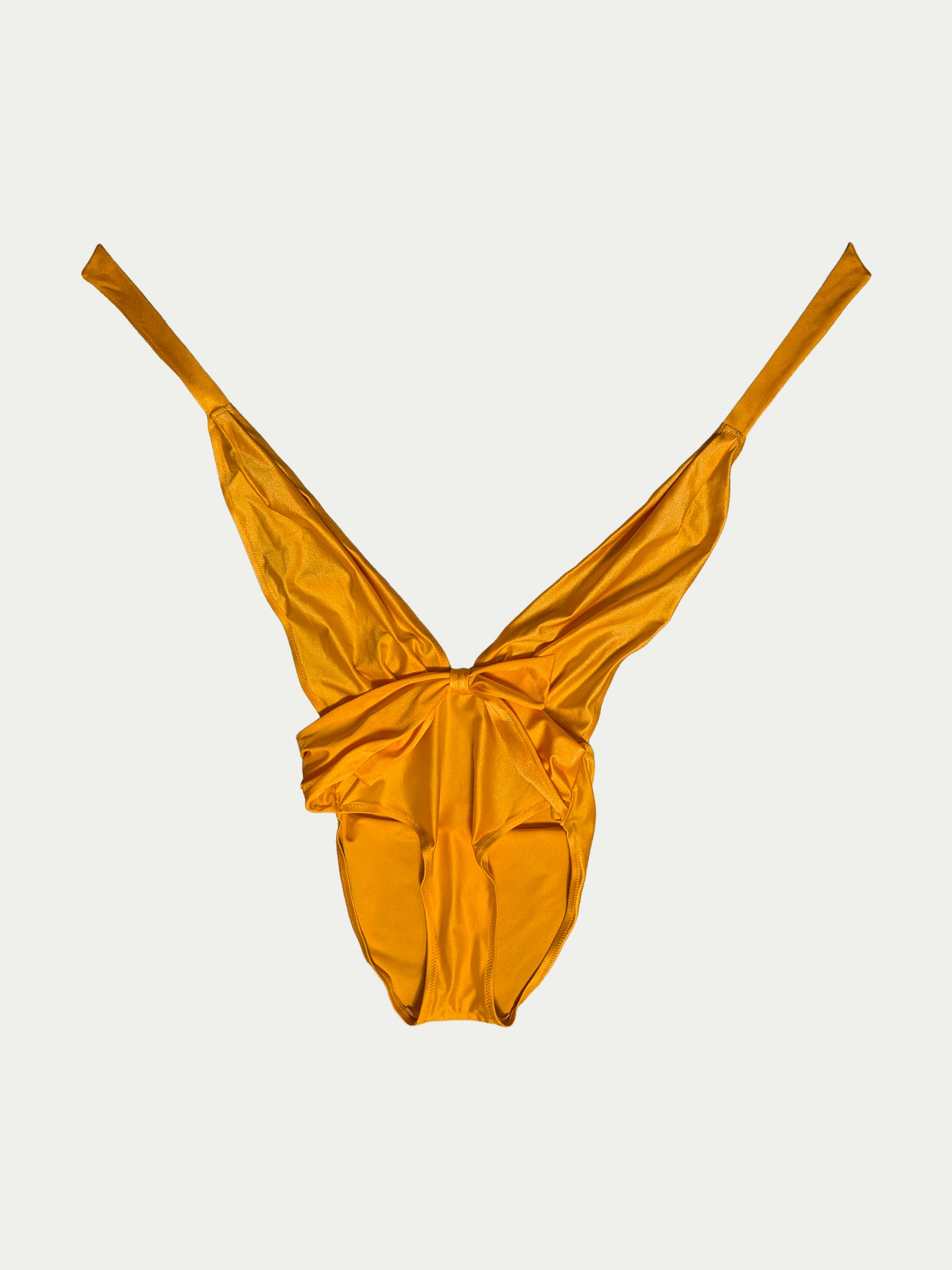 One-piece swimsuit in a yolk-yellow shade, featuring a high-waisted bottom, fully open back, and an extra-deep neckline formed by two pleated chest tie straps.