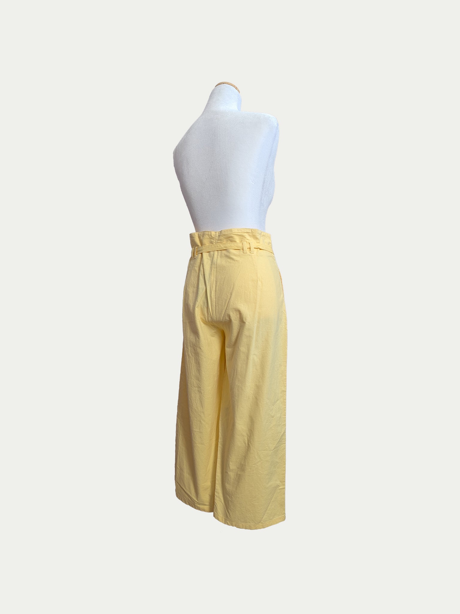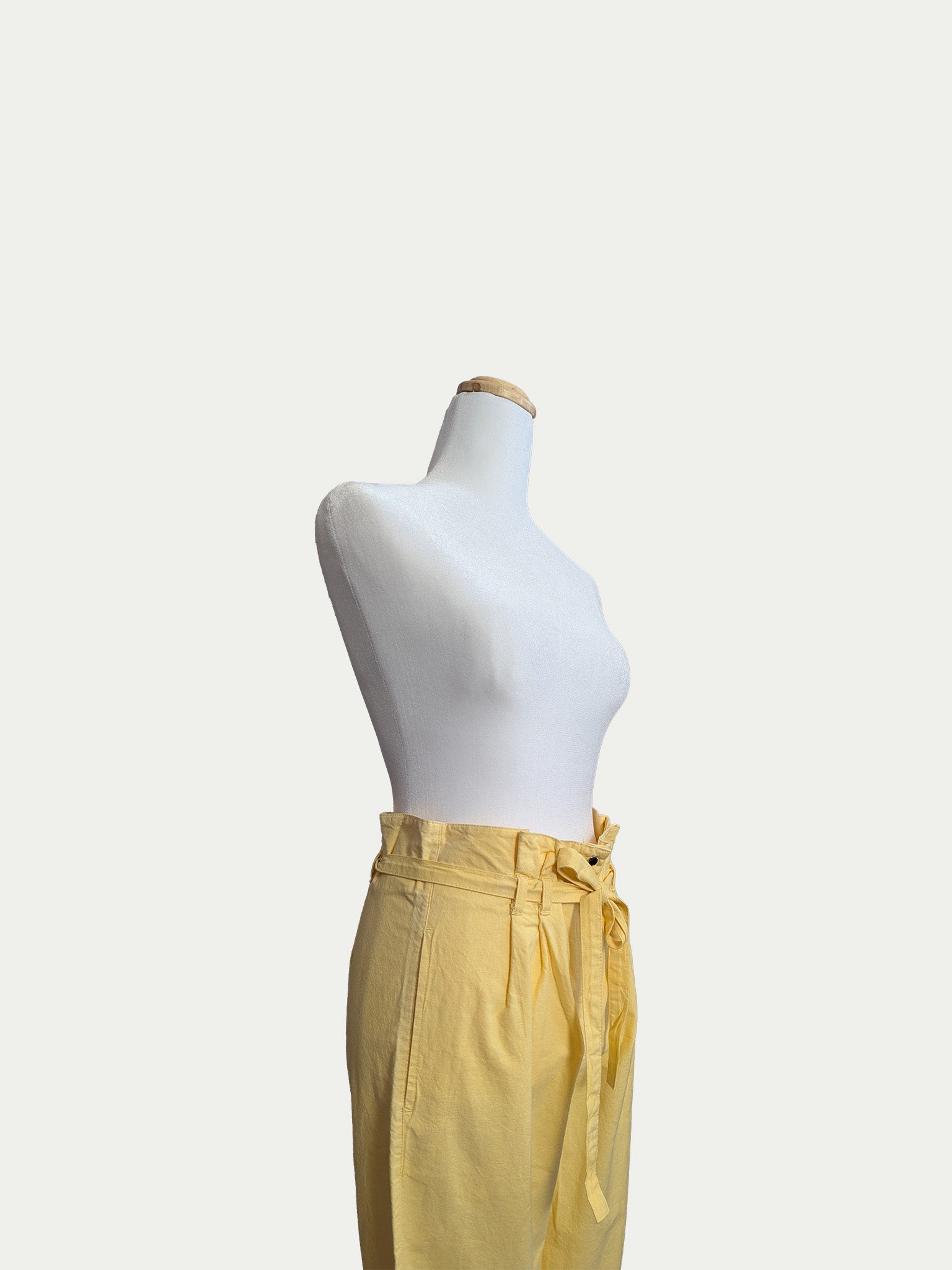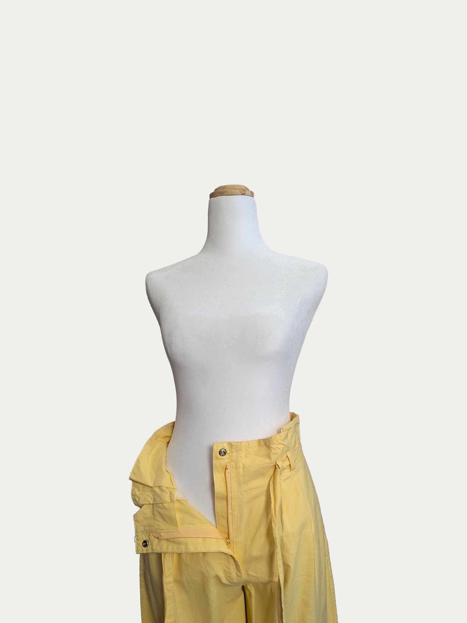Early 90s pleated cotton pants in a pastel yolk-yellow shade. Features a waist tie strap for adjustable fit, front zipper and snap-fastener closure, and a subtle balloon silhouette. Two front pockets and a cropped 3/4-7/8 length for a playful, relaxed look.