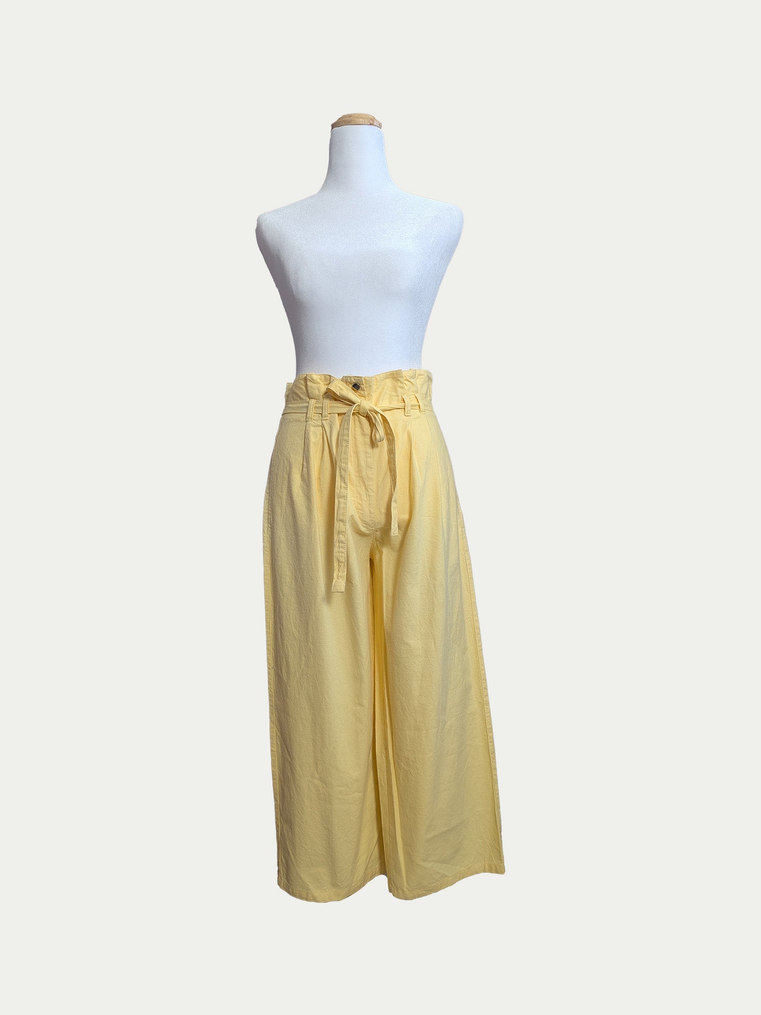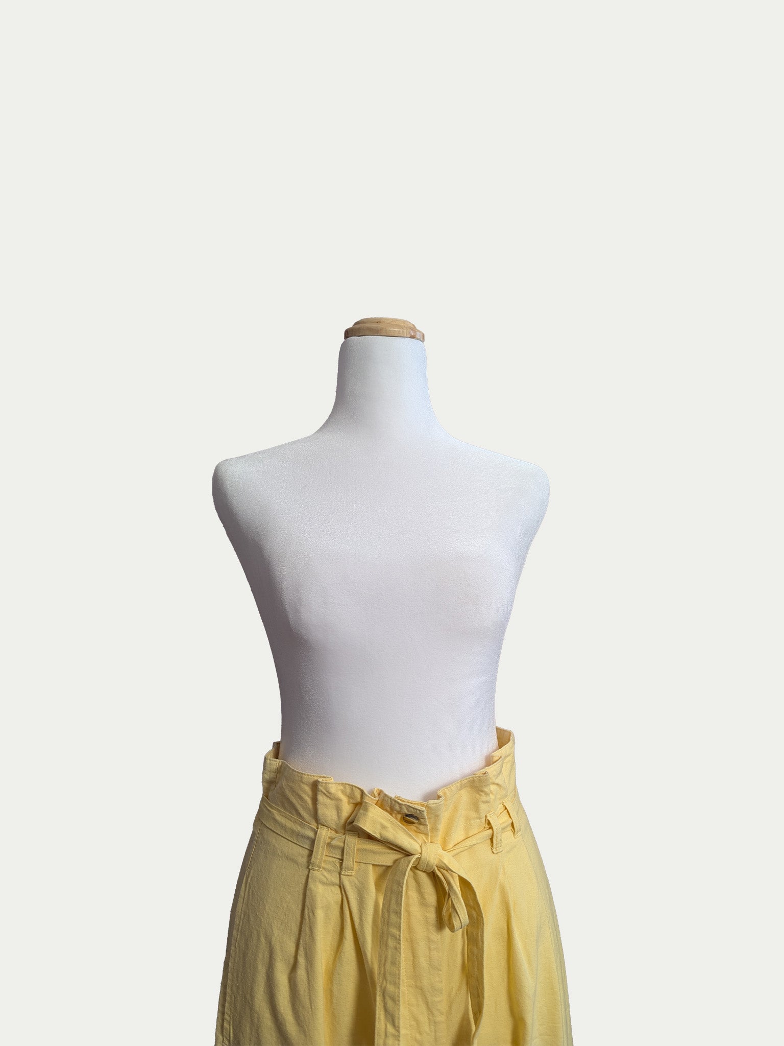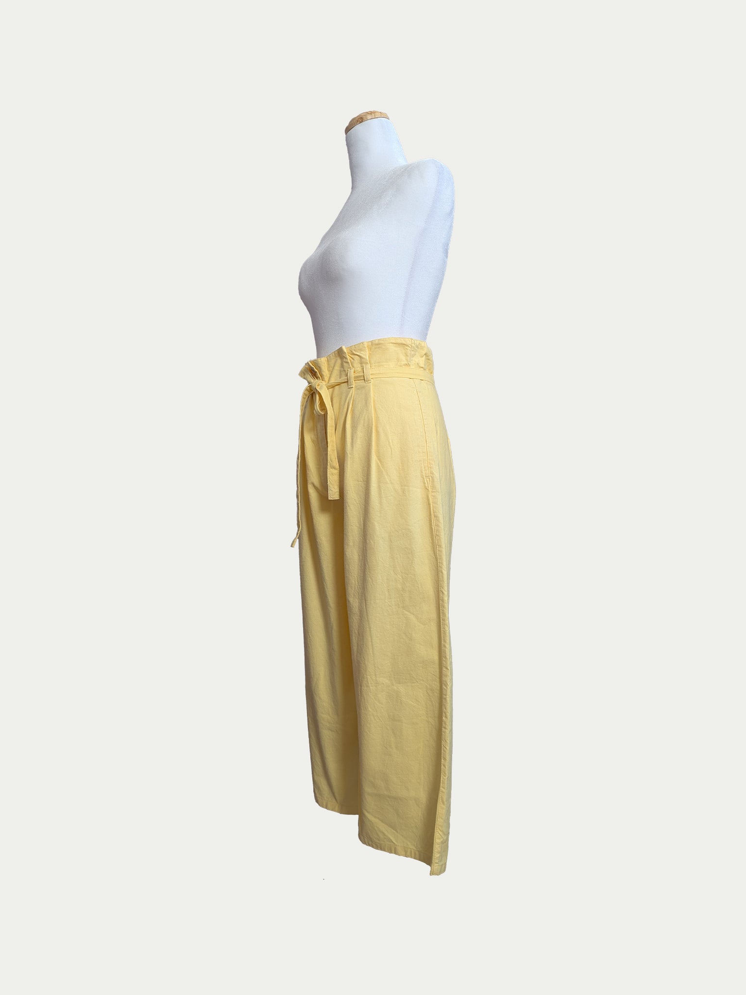 Early 90s pleated cotton pants in a pastel yolk-yellow shade. Features a waist tie strap for adjustable fit, front zipper and snap-fastener closure, and a subtle balloon silhouette. Two front pockets and a cropped 3/4-7/8 length for a playful, relaxed look.