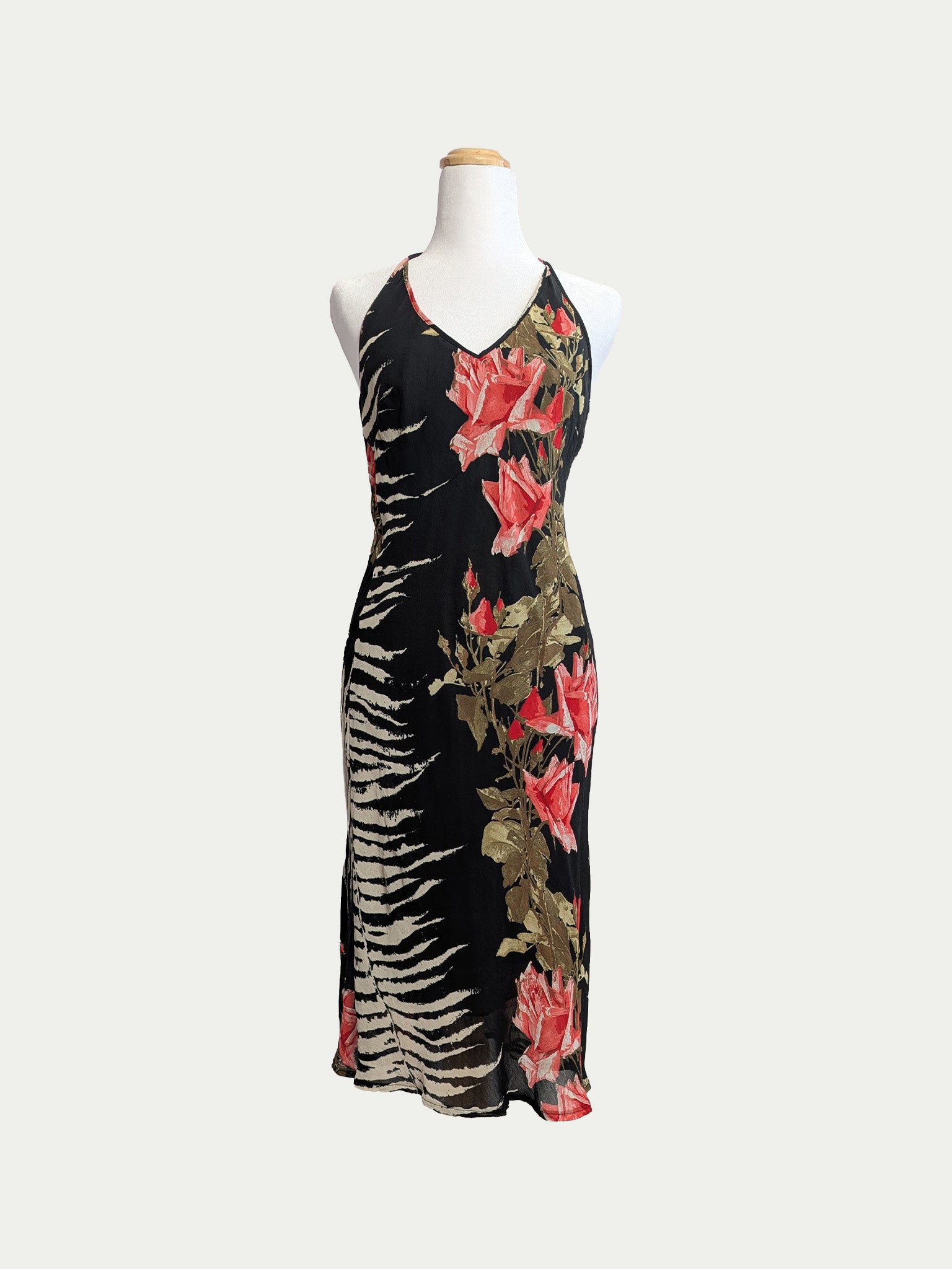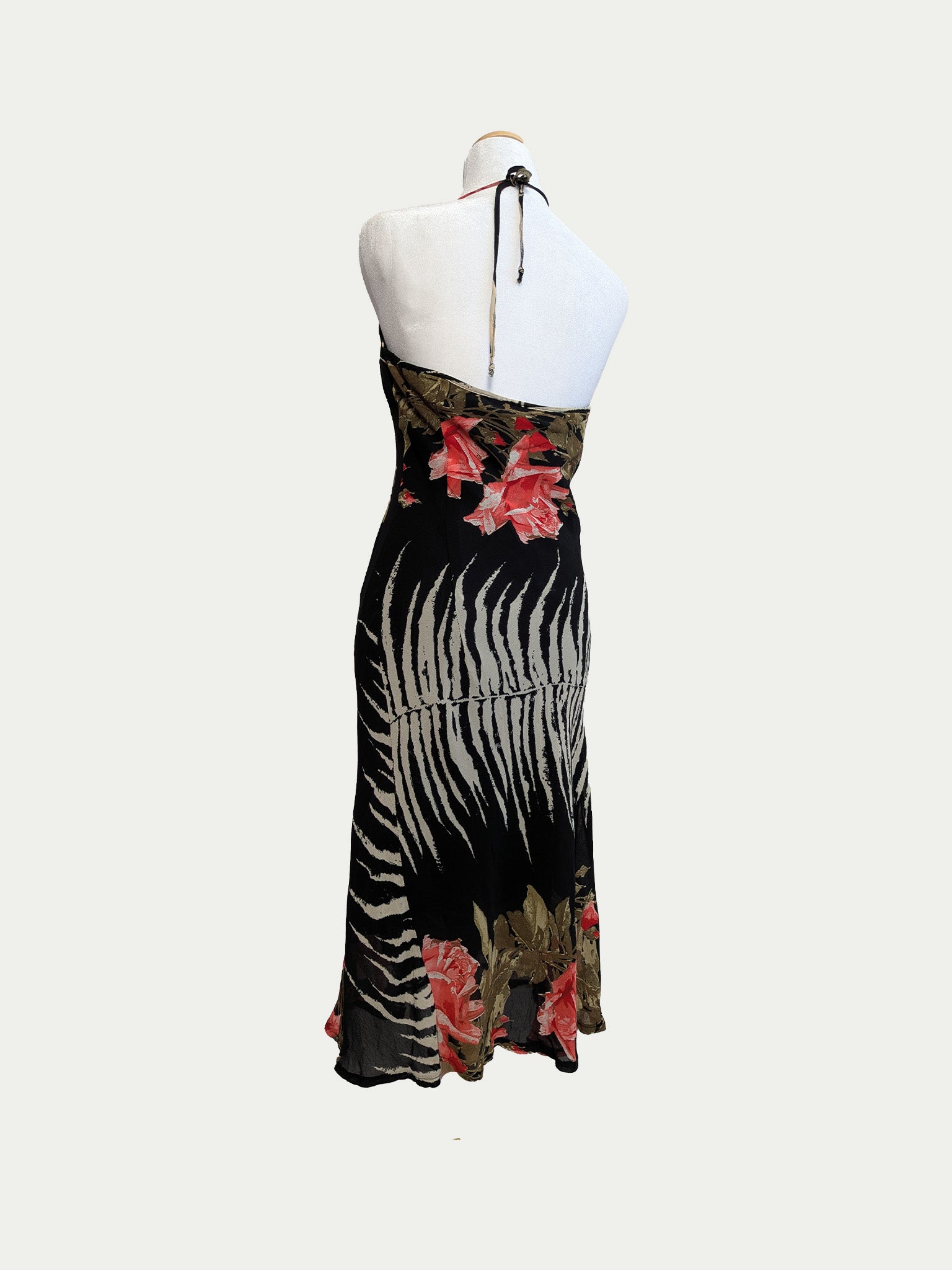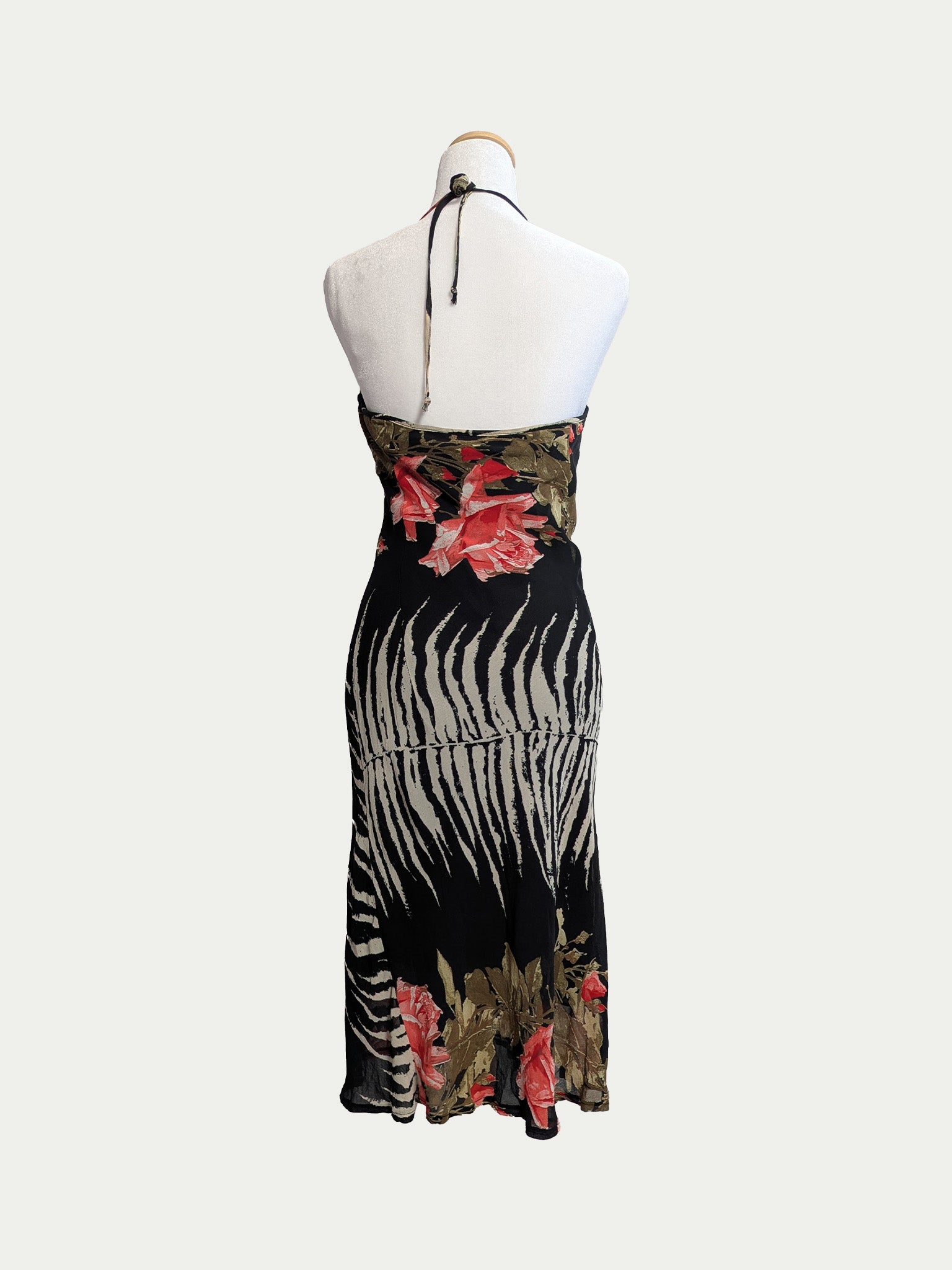 90s halter tie midi dress featuring a rare zebra-and-roses print. Classic body-hugging fit with a soft drape.