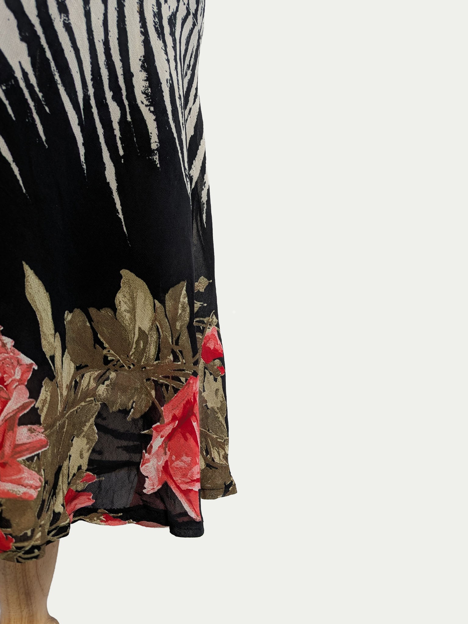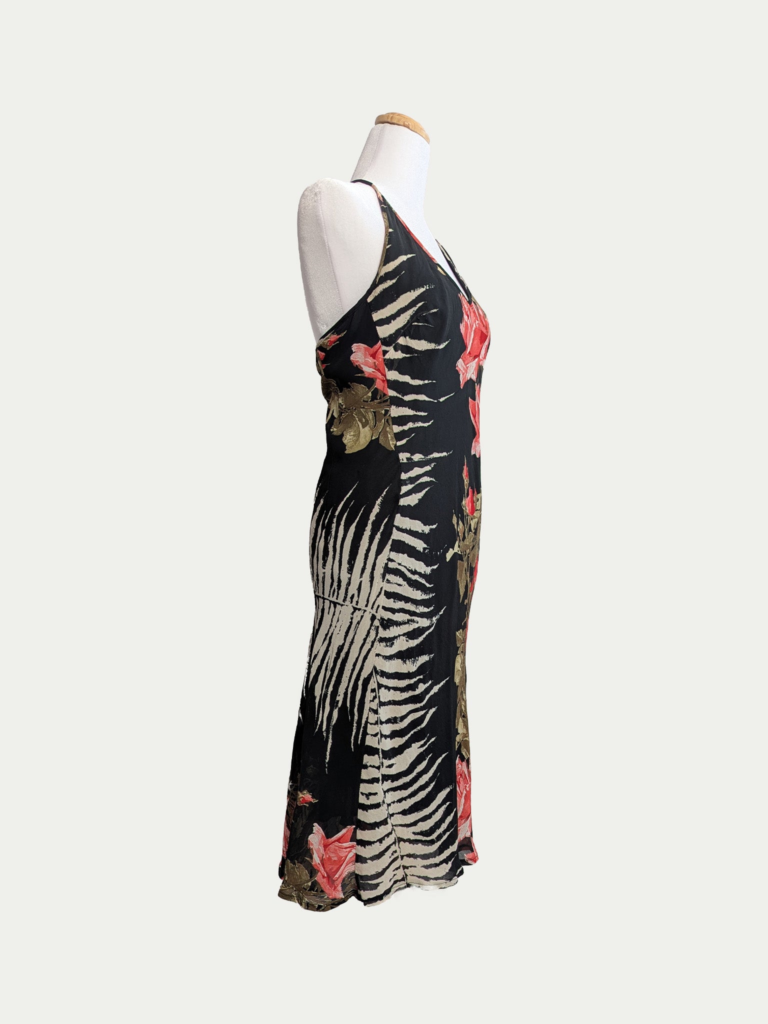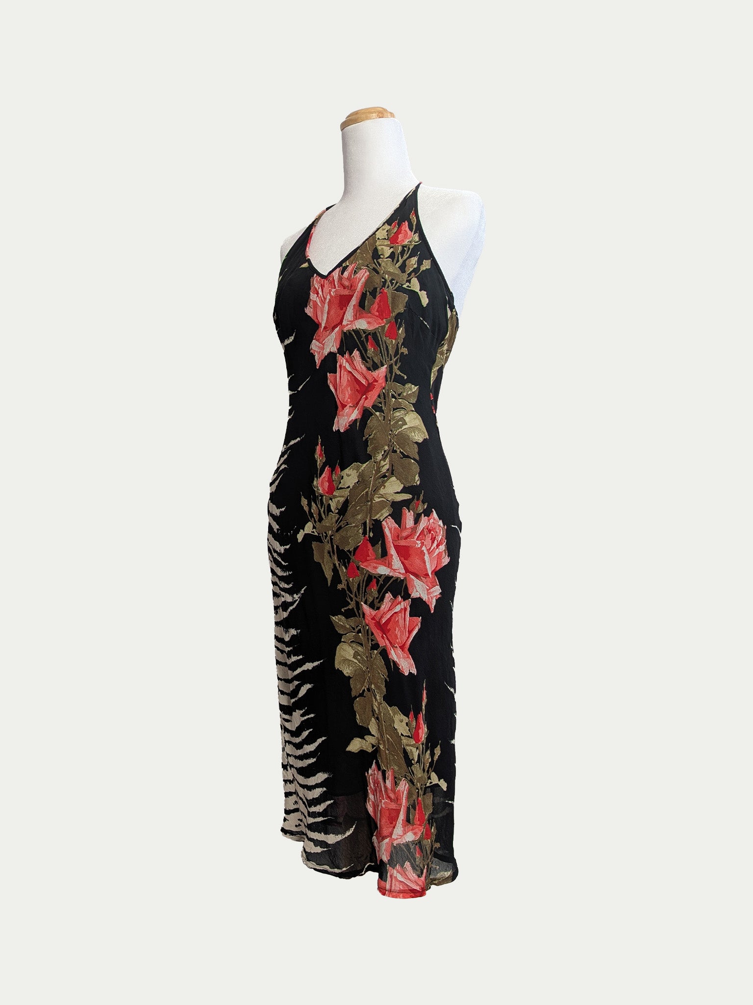 90s halter tie midi dress featuring a rare zebra-and-roses print. Classic body-hugging fit with a soft drape.